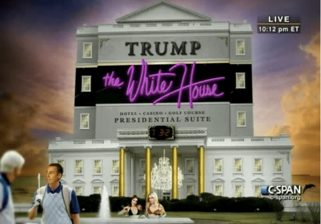 Donald Trump had been waiting for his moment since the late 1980s, when he first mulled a jaunt for White House. His mind was surely crystallised, however, when he was so wondrously lampooned by Barack Obama at the 2011 White House Correspondents’ Dinner. This included the President mocking up an imagined Trump White House complete with garish neon, gold pillars and hot tub on the south lawn. Trump must have thought through gritted teeth, ‘I’m going to wipe the smile off his face’.