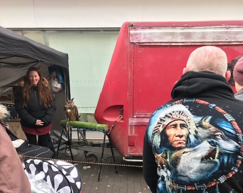 I join a gaggle of pensioners taking a break on the benches. They must be seriously worn out as there’s a sale on at Holland & Barratt. Outside of Priory Meadow, on Wellington Place, it is market day. There’s a fairly typical range of stalls selling a variety of tatt, but one catches my eye. A red trailer provides the backdrop for a makeshift owlery, with five different owls sat on perches eyeing the Saturday shoppers with bemused suspicion. A stall sells owl-related products, including memorabilia and owl-rearing equipment.