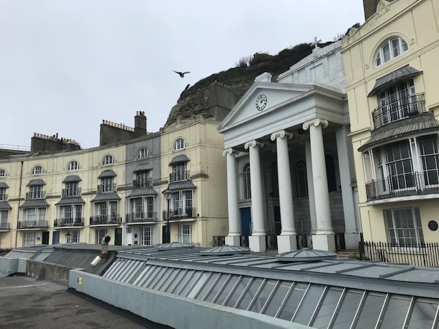 Hastings pier is closed at the time, but looks nice through the locked gates. It might seem strange to come to a seaside town in the middle of winter. From living in Brighton, however, I know that you only see the reality of such a place when it is out of season. You understand more about a place’s character when the screaming stops. The sea is calmer today and the sky lighter. At Warrior Square, old Regency buildings form a ring around the space with a good sense of majesty. But the clouds soon darken again and it starts to rain.
