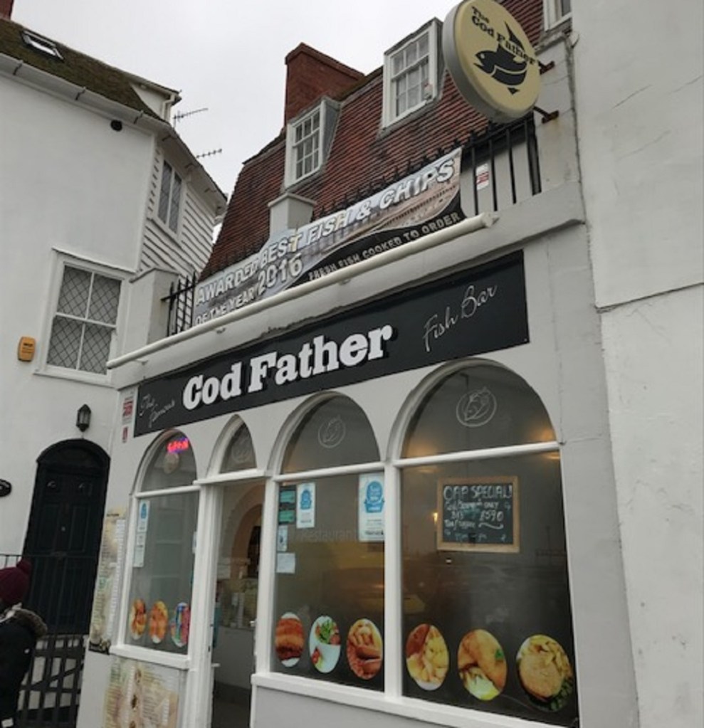 Although there are plenty of places at which to indulge in fish and chips, I choose the Cod Father, because, well, why wouldn’t you? According to a large banner above the shop, it was apparently voted ‘best fish and chips of the year in 2016’. Not only is this accolade now three years old, but it’s not particularly clear who awarded such an honour. A board advertises an OAP Special of cod or scampi with a cup of tea for £5.90. Damn you, youth.
