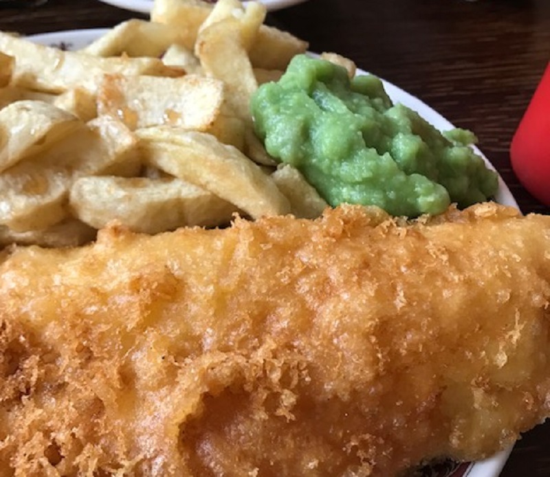 We sit down at a table and peruse the menu, while also eavesdropping on two couples nearby, average age of around 65, discussing the merits of different types of hearing aids. We order and not too long after arrives mountainous plates of cod and chips. The portions are huge – fish falling over the plate, chunky chips and a bucket of mushy peas. Bread is optional, but encouraged. We eat until it gets uncomfortable to go any further.