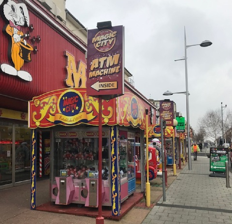 We head towards the sea front, across the precinct at the bottom of Station Avenue and onto Pier Avenue, a tight single lane road down to Marine Parade on the front. The Magic City arcade hums away on the right hand side of us, with brightly coloured buzzing machines lined up outside and processional banners pronouncing that it has an ATM inside in case you’re short of cash. On the other side is Amusements Gaiety Amusements, a clunky but base-covering name if ever there was one.