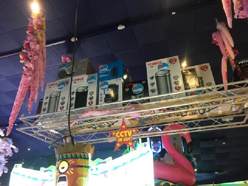 We follow the enslaved ride on its journey back to Clacton Pier. Although work is being done on repairs it is still possible on this spring day to get onto the pier. As we enter the amusement arcade we’re hit with the usual wall of noise. Hundreds of machines compete in a bleeping contest, punctuated by chattering floods of coins, like pots and pans falling down a flight of stairs. Prizes are available for winning tickets, and you can see the promised bounty hanging from the ceiling. It’ll take a rather daunting 10,000 tickets to win a slow cooker. Winning 8,000 tickets seems somewhat more achievable to take home a fetching pedal bin. Both challenges appear to be utterly beyond us, particularly as our reaction speeds are still rather slowed by the still digesting mound of carbohydrate in our stomachs.