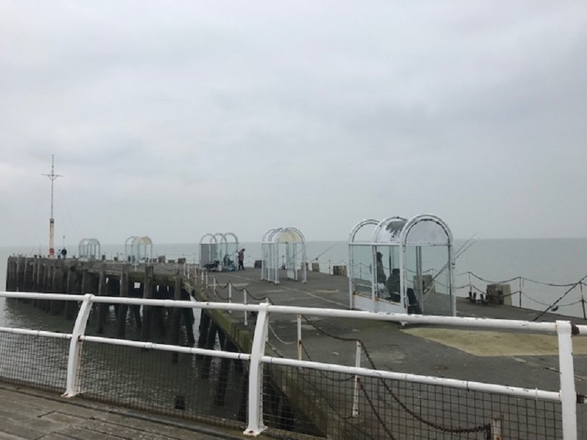 Instead, we leave the orchestra of victory behind and head outside onto the pier. The sea air whips across as we navigate the various attractions and amusements, most of which are closed for the winter. At the end is a rotunda café giving panoramic views out to sea. It’s virtually deserted on the wooden board pier, barring some men fishing at the far end inside glass walled enclosures, like bus stops, giving them some protection from the elements. Their fishing rods twitch in the air, but no one seems close to a catch. We stand and look out to sea, enjoying the moment and the silence.