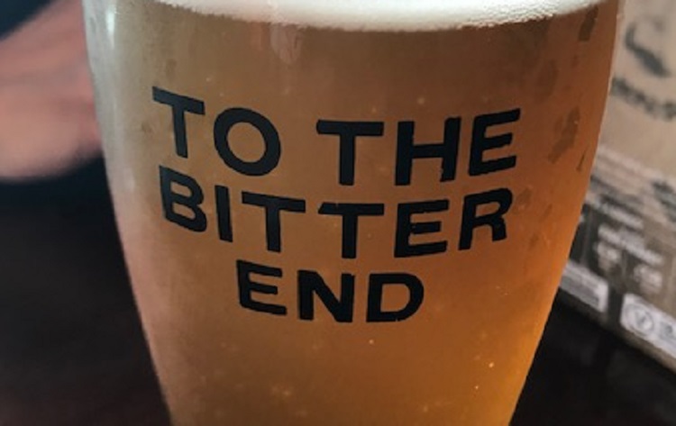 As is often the case with these trips, I end up in a Wetherspoons. It is, after all, hard to resist the siren song of cheap beer and sticky carpets. In the Moon and Stars, we get another drink and sit down on one of the high tables. A couple sat near the window canoodle each other, periodically slugging on large bottles of Hooch or going out for a cigarette break. The latest Brexit developments are displayed on the flatscreen TV on the wall. A man idly watches with a grim-faced expression. I look down at my pint glass. The golden liquid inside illuminates a marketing slogan on it. It says; ‘TO THE BITTER END.’